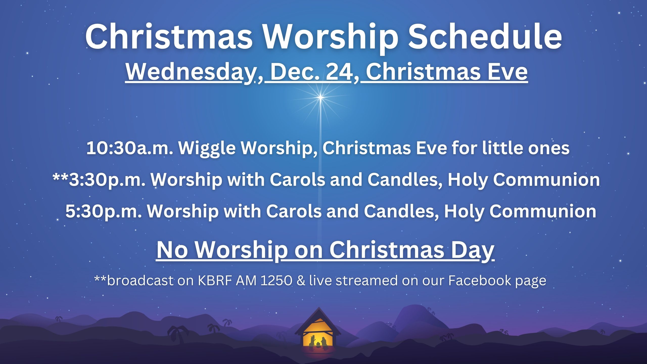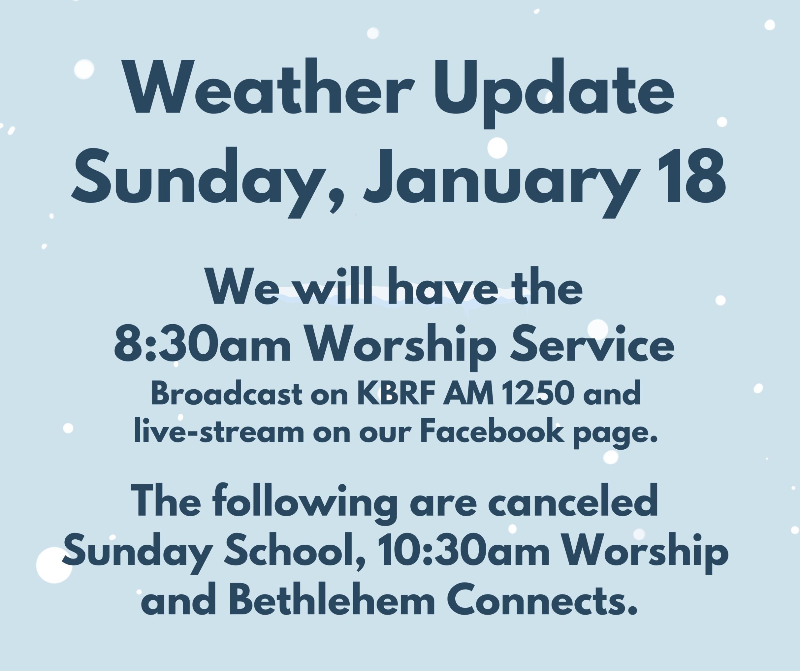 - 8:30am Traditional Worship Service, also broadcast on KBRF 1250 AM & live streamed on our Facebook page.